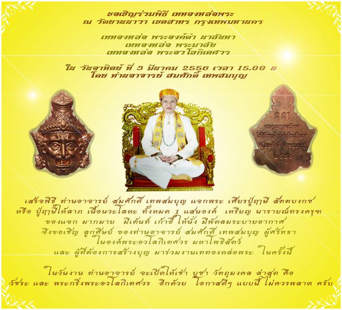 จึงขอเชิญ ลูกศิษย์ ของท่านอาจารย์ สมศักดิ์ เทพสมบุญ ผู้ศรัทธา ในองค์พระอวโลกิเตศวร มหาโพธิสัตว์ และ ผู้ที่ต้องการสร้างบุญ ร่วมงานเททองหล่อพระ
