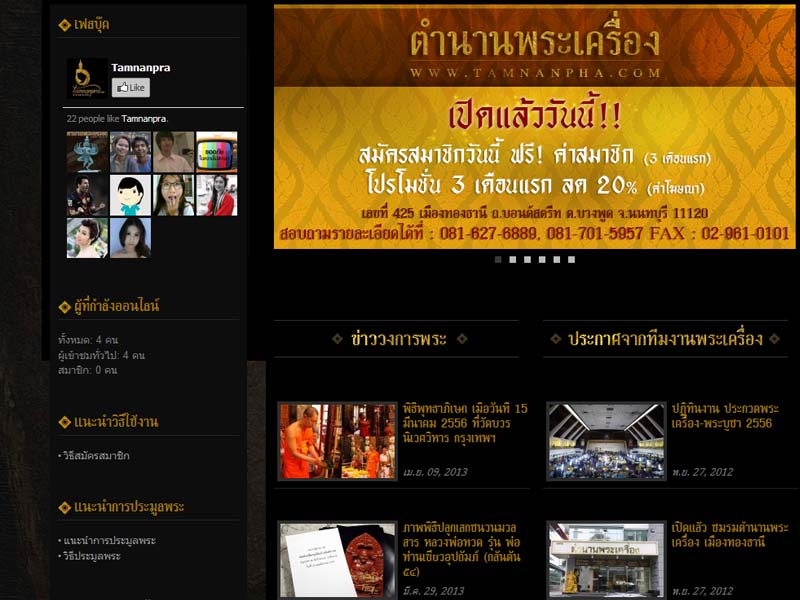 เว็ปไซต์ www.tamnanpra.com (ตำนานพระ.คอม) สมัครสมาชิกตอนนี้ใช้งานฟรี 3 เดือน โดยเป็นเว็ปไซต์เกี่ยวกับพระเครื่อง สมาชิกสามารถนำพระเครื่องมาตั้งกระทู้ประมูลและมีการรับออกใบรับรองพระแท้ โดยมีมาตราฐานในการออกใบรับรองพระแท้จากผู้เชี่ยวชาญโดยตรง ตรวจเช็คพระเครื่องทุกประเภทครับ ยังไงลองเข้าไปเยี่ยมชมได้ครับ |