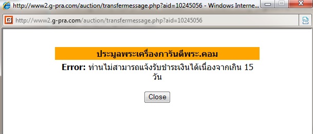 พอดีผมจัดส่งพระไปออกบัตร หลังจากออกบัตรแล้วก็แจ้งทางผู้ชนะประมูลว่าบัตรออกแล้ว เมื่อผู้ชนะประมูลโอนเงินมา ผมก็เข้าไปกดแจ้งที่หน้ากระทู้ตามไฟล์ภาพครับ และทางระบบแจ้งว่า " ท่านไม่สามารถแจ้งชำระเงินได้ เนื่องจากเกิน 15วัน"