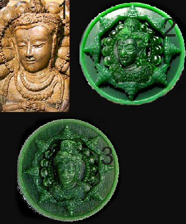 (2)..................ในภาพที่มีหมายเลข... 2...เป็นแบบที่สองที่ได้รับการแก้ไข สีออกเขียวๆเพราะเป็นต้นแบบขนาดจริงก่อนแกะบล้อคเหล็กครับ ขนาด 5.5 CM เรียกว่าแกะเทียนหรือบล้อคเทียนครับ (ผมว่าสวยนะแจ่มดีครับไม่เหมือนใคร)แต่ทีมงานช่าง กลับไม่พอใจกับผลงาน เพราะองค์พ่อท่านหันข้างเป็นรูปแบบที่ละม้ายคล้ายกับ จตุคามรุ่นราชันย์ดำ..ถึงเครื่องทรงองค์ท่านจะละเอียดอลังการกว่าแต่ก็มาแนวๆดียวกัน เลยต้องแก้ไขใหม่ปรับปรุงใหม่อีกครั้งครับ ((ชมจากภาพเห็นเป็นก้อนเทียนสีเขียวๆอย่าเพิ่งตกใจครับแค่ต้นแบบเนื้อเทียนช่องไฟความลึกความคมความสวยอาจดูยากดูยังไงก็ไม่สวยแต่ลองจินตนาการดูครับว่าถ้าเป็นเนื้อผงว่านจริงๆจะขนาดไหนรับได้มั้ย))