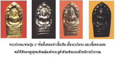 พระปรกมะขามรุ่น 17 ทั้งเนื้อทองคำ เนื้อเงิน เนื้อนวะโลหะ และเนื้อทองแดง