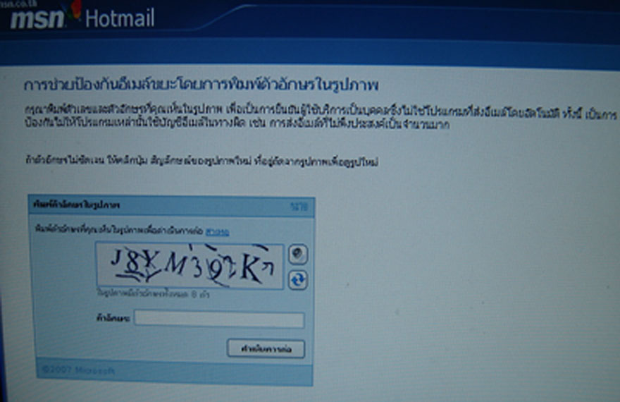 ใช้ hotmail ครับ ปกติผมก็ไม่ค่อยประสาเรื่องคอมพิว อยู่แล้ว หลังจากเราป้อนรหัสผ่านมาแล้ว หน้าจอจะโชว์แบบนี้เลย ตอนแรกคลิ๊กทิ้งได้ ตอนหลังไปไหนไม่ได้เลยครับ เข้ามาแล้วขึ้นให้เราป้อนตัวอักษรตามภาพ อยากทราบว่าท่านที่ใช้แบบเดียวกับผม ต้องป้อนตัวอักษรหรือเปล่า รู้สึกแปลก เลยเข้ามาถามผู้รู้ดีกว่า รบกวนด้วย ช่วงนี้ผมเลยเปิดเข้าไม่ได้ ช่วยแนะนำด้วยครับ...ครับ... |