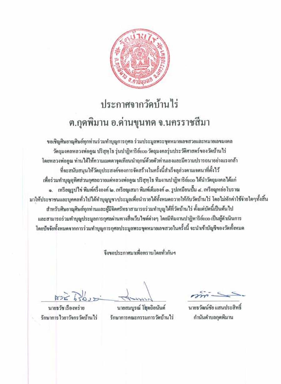 สำหรับศิษยานุศิษย์ทุกท่านที่สนใจสามารถร่วมทำบุญได้ที่วัดบ้านไร่ ตั้งแต่บัดนี้เป็นต้นไป
