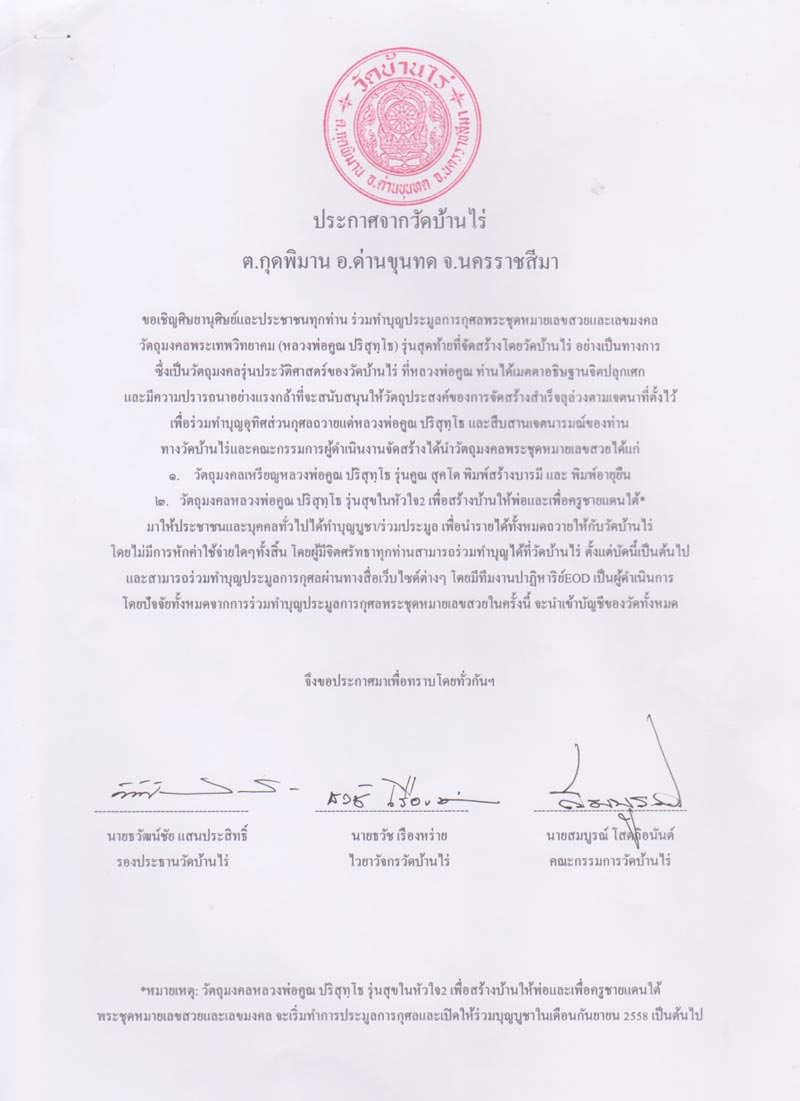สำหรับศิษยานุศิษย์ทุกท่านที่สนใจสามารถร่วมทำบุญได้ที่วัดบ้านไร่ ตั้งแต่บัดนี้เป็นต้นไป