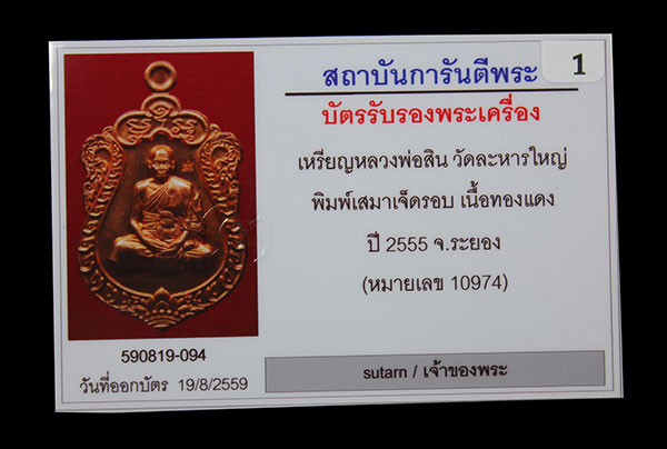 ตามที่ทีมผู้สร้างบางท่านแจ้งว่าโค๊ดศาลาเล็กไม่มีการตอกในเหรียญเสมา 7 รอบ หลวงพ่อสิน วัดละหารใหญ่ มีตอกแต่เพียง โค๊ดศาลาใหญ่ เท่านั้น ผมจึงส่งเหรียญเสมา 7 รอบ หลวงพ่อสิน โค๊ดศาลาเล็ก และโค๊ดศาลาใหญ่ ไปตรวจสอบออกบัตร ผลปรากฎการันตรีออกบัตรให้ทั้ง 2 เหรียญ เป็นพระแท้ออกบัตรได้ และไม่กล่าวถึงโค๊ดศาลาเลยว่าโค๊ดไหนแท้โค๊ดไหนเก๊ การันตรีสถาบันหลักเรื่องพระเครื่องการันตรีมาแบบนี้เช่าซื้อสบายใจทั้งโค๊ดศาลาเล็กและโค๊ดศาลาใหญ่ครับ