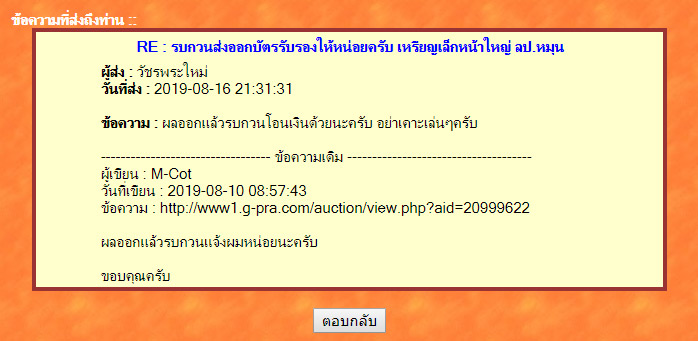 พระปิดประมูลให้ส่งออกบัตร หลังผลออกยังไม่เกินกำหนดการโอนเงินก็ส่งข้อความมาเหมือนเราไม่มีเงินเช่า หาว่าเราไปเค้าเล่นซะงั้น อ่านแล้วบางทีก็ขำดีเหมือนกันครับ  |