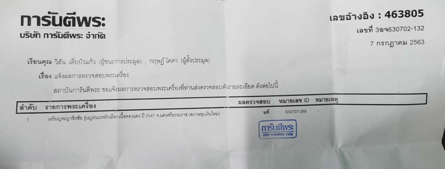 ผมจึงอยากทราบว่า ทั้ง "ผู้ตั้งประมูลคนที่2" และ "ผู้ตั้งประมูลคนที่3" หลังจากจบประมูล ไม่มีความประสงค์จะแจ้งออกบัตร แต่ "ผู้ชนะประมูล" ประสงค์ให้ออกบัตรและการส่งตรวจสอบ ซุ่งผลก็ออกมาว่า เป๋็นพระแท้ทำกะไหล่เงินใหม่ดังรูปที่ผมลงแนบมาด้วย ความรับผิดชอบควรจะอยู่ที่ใครครับ