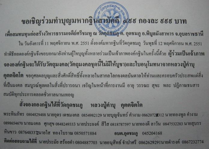 ขอเชิญเพื่อน สมาชิก ร่วมทำบุญมหากฐินสามัคคี (หลวงปู่คำบุ คฺตตจิตโต) เพื่อสมทบทุนสร้างวิหารธรรมเจดีย์สีชมพู ณ วัดกุดชมภู ต.กุดชมภู อ.พิบูลมังสาหาร จ.อุบลราชธานี