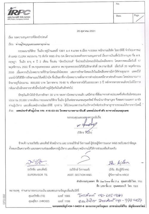 กระผมนายกิติกร รื่นเริง ผู้เป็นพ่อขาดแคลนทุนทรัพย์ ที่จะนำมารักษาบุตร จึงขอความเมตตามายังท่านผู้บริหาร และเพื่อนพนักงาน ไออาร์พีซี ทุกท่าน
