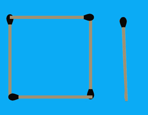 คือหากมี..ไม้ขีดไฟ 5 ก้าน(ไม้ขีดแบบธรรมดาน่ะครับ)แล้วให้เราใช้ไม้ขีดทั้ง 5 ก้านนั้นทำเป็นรูปสี่เหลี่ยมจตุรัส 2 รูป จะทำอย่างไหนดี ลองเอาไปคิดกันนะครับ ห้ามหักห้ามตัดต่อนะครับและต้องใช้ทั้ง 5 ก้านด้วยนะ.................