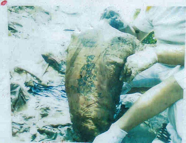 รูปนี้ถ่ายจากงานล้างป่าช้า พบร่างหนึ่งเหลือแต่ตัว ส่วนอื่นๆ สิ้นสภาพไปตามกาลเวลา ปรากฎว่าที่แผ่นหลังมีรอยสักยันต์ หนุมาน ไว้ จึงได้มีการสืบหาว่าอาจารย์ท่านใดที่สักยันต์นี้ ตอนหลังพบว่า เป็นการสักของหลวงพ่อกาหลง เขี้ยวแก้ว แห่งปราจีนบุรี