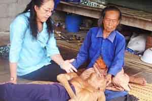 จากนั้น นางศรีภิญโญ นำคณะสื่อมวลชน เดินทางเข้าไปในหมู่บ้านหนองกก ที่บ้านเลขที่ 86 หมู่ 3 ปลูกเป็นบ้านไม้ชั้นเดียว กว้างยาวประมาณ 5 เมตรเศษ ตั้งอยู่ตรงข้ามวัดบ้านหนองกก ต.หนองบัวน้อย ภายในบ้านพบนางอ่อนจันทร์ เตื่อยจันทึก อายุ 82 ปี เจ้าของบ้าน กำลังนั่งป้อนข้าว นายจรัญ เตื่อยจันทึก อายุ 49 ปี บุตรชายอยู่อย่างทุลักทุเล เนื่องจากนายจรัญ พิการมาแต่กำเนิด แขนกับขาทั้ง 2 ข้างลีบและบิดผิดรูป ปากเบี้ยวและลำตัวบิดงอ กว่าจะป้อนข้าวใส่ปากได้แต่ละคำ ต้องใช้ความพยายามอย่างมากเพราะนอกจากร่างกายนายจรัญจะพิการแล้ว ยังมีอาการชักกระตุกอยู่ตลอดเวลา นางอ่อนจันทร์ต้องใช้เชือกไนล่อนผูกแขน และขาพันธนาการไว้อย่างแน่นหนาเพื่อป้องกันเล็บขีดข่วนตามร่างกายในระหว่าง ที่ชักกระตุก ตามเนื้อตัว หน้าตา ถูกข่วนเป็นแผลทั่วตัว