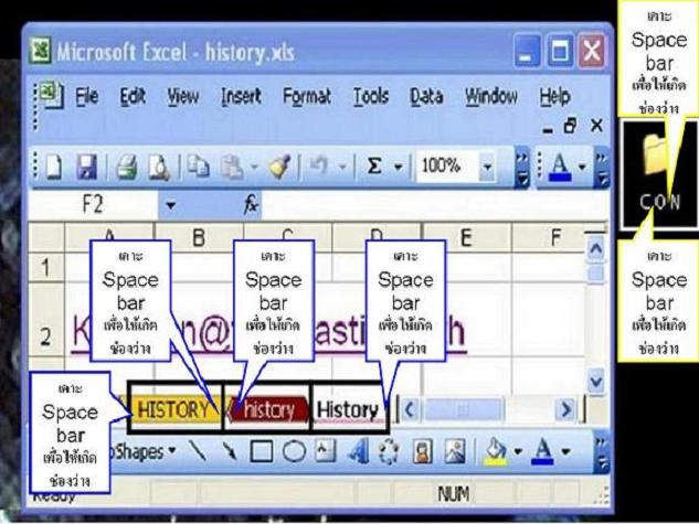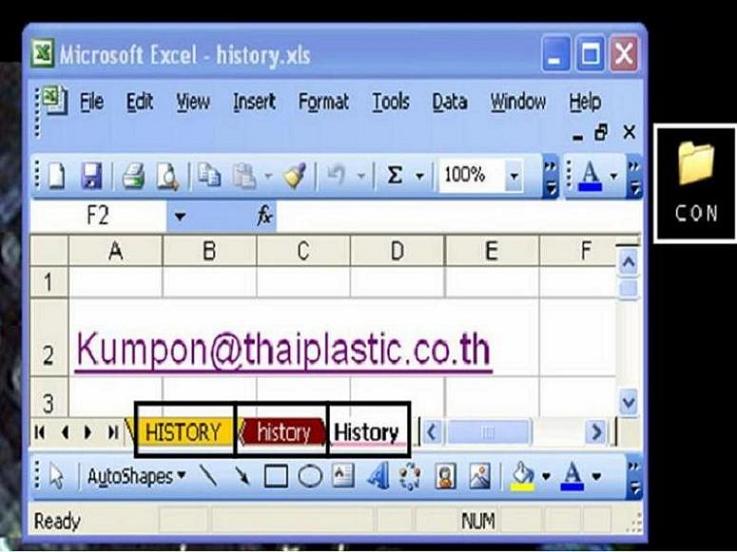 ส่วน File excel ไม่สามารถใช้คำว่า History ตั้งชื่อชีทได้นั้นเพราะว่า History เพราะเป็นชื่อที่สงวนไว้ใช้ในระบบโปรแกรม ชื่อตารางไม่ควรใช้ชื่อว่า Database เพราะ Excel เตรียมไว้ใช้กับคำสั่ง Data > Form หรือชื่อตารางว่า Criteria เพราะจะถูกทำลายทิ้งทันทีเมื่อใช้คำสั่ง Data > Filter > Advanced Filter แบบกำหนด Criteria