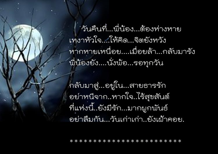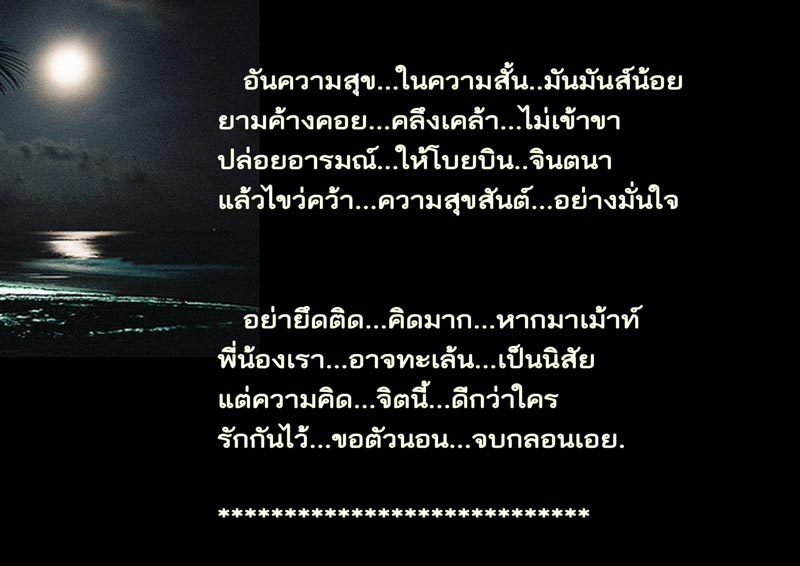 | หัวข้อกระทู้ : พี่ลูกน้ำผมขอรวมบทกลอน..ก่อนยามนอนทุกคืนพี่ฝากไว้..เป็นคำสอนคำคมให้อุ่นใจ..เมื่อหลับไปจะได้หลับฝันดี |