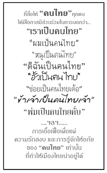 ทั้งนี้เพื่อให้เมืองไทยของเรา “คนไทย” ทุกคน กลับมาเป็นประเทศที่น่าอยู่อย่างที่เคยเป็นอย่างรวดเร็วจากความร่วมมือของเรา “คนไทย” ทุกๆ คน