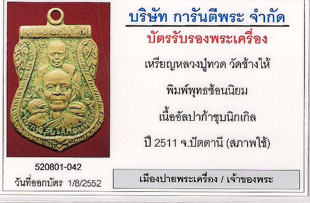 เนื่องจากได้พบเห็นในเวป บัตรรับรองพระรุ่นเดียวกันพิมพ์เดียวกันแต่มีข้อความไม่เหมือนกัน ผมว่า ถ้าจะให้เหมาะสมต้องใช้ข้อความเดียวกันครับ ส่วนสภาพเป็นอย่างไรก็อยู่ในวงเล็บเช่นเดิม เช่น ผมเจอพระ ลป.ทวด องค์หนึ่งออกบัตรรับรองว่า