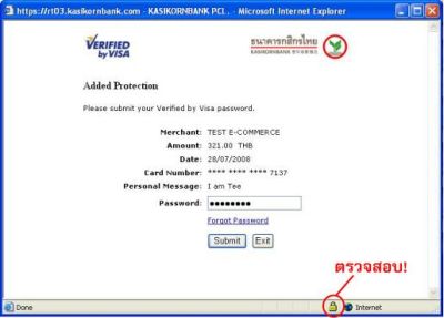 หากพบ Pop-up ดังกล่าว โปรดอย่าตอบกลับหรือให้ข้อมูลใดๆ ทั้งสิ้น นอกจากนี้ ธนาคารขอให้ท่านทำการตรวจสอบเว็บไซต์ก่อน submit ข้อมูลใดๆ โดยคลิกที่สัญลักษณ์ "รูปแม่กุญแจ" ที่มุมขวาล่างของ browser เพื่อตรวจสอบข้อมูล Certificate ให้แน่ใจว่าเป็นเว็บไซต์ของธนาคารจริง