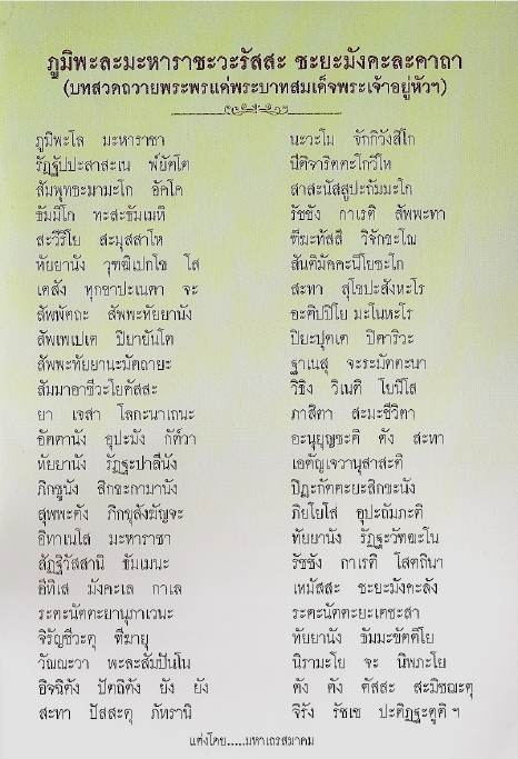 เป็นสะระณะ เป็นที่พึ่งอันประเสริฐสูงสุดของข้าพเจ้า ด้วยเดชแห่งสัจจะวาจานี้ขอชัยมงคลทั้งหลายจงมีแด่พระบาทสมเด็จพระเจ้าอยู่หัวของชาวไทยด้วยเทอญ