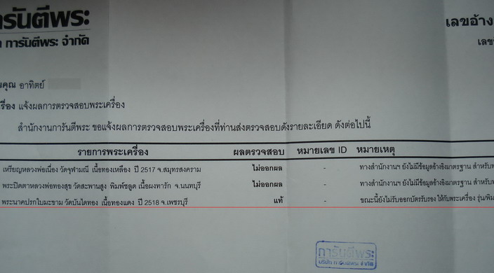 แท้ ขณะนี้ยังไม่รับออกบัตรรับรอง ให้กับพระเครื่องรุ่น/พิมพ์ นี้