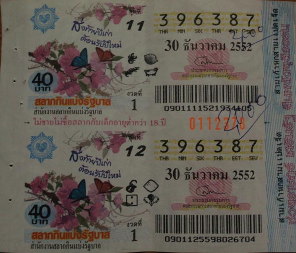 บ่าย...เมื่อวาน ประชุมอยู่ เสียงโทรศัพท์ดังขึ้น เสียงคนแก่พูดว่า "ทำไมไม่ไปเอาล๊อตเตอรี่ ที่สั่งไว้ตั้งแต่ 30 ธ.ค " ผมหละงง....นึกได้ว่าสั่งเขาไว้จริง ลืมไปเลย....วันนี้ไปเอา เฮียเขาบอกว่า ถูกเลขท้าย 2 ตัว ไม่เอาเหรอะ 2000 บาท ผมก็ยัง งงๆ อยู่เลย