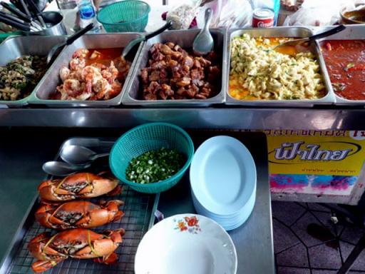 ไปจากแยกเฉลิมกรุง เข้าถนนตีทอง จะเจอคลองหลอดวัดราชบพิตร ตรงริมคลองหลอดนี้ เป็นทางเดินริมคลองชื่อว่า ตรอกวิสูตร ทางกทม. จะทำเป็นทางเดินสวยงาม ในตรอกวิสูตรนี้ก็จะมีแผงขายอาหารอยู่หลายเจ้าด้วยกัน คุณแอ๋วก็ตั้งอาหารที่ทำสำเร็จไว้ในถาด ประกอบไปด้วย กุ้งทอดกระเทียม เนื้อปูผัดผงกระหรี่ หมูหวาน พร้อมทั้งปูทะเลต้ม