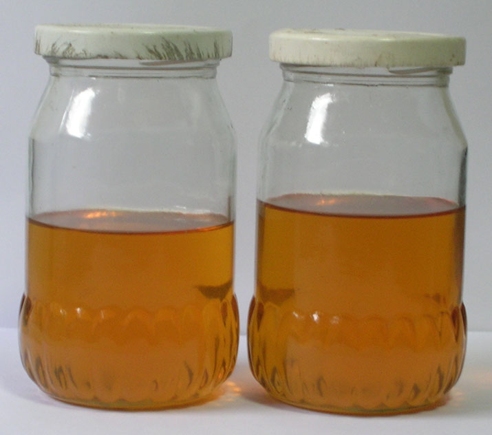 ลักษณะรูป รูป-รส-กลิ่น-สี...ของน้ำมันไบโอดีเซลจากน้ำมันพืชใช้แล้ว ที่ผมทำได้เป็นลักษณะแบบนี้ครับ ผมเคยทำจากน้ำมันปาล์มใหม่ สีจะออกเหลืองเหมือนน้ำมันพืช หรือเรียกว่าสีจะจางกว่านี้มาก ดังนั้นสีจะเข้มหรือสีจะจางไม่ใช้เรื่องสำคัญหรอกครับ เพราะนั้นก็ขึ้นอยู่กับน้ำมันตั้งต้น ที่สำคัญไบโอที่ดีจะต้องใส จะสีอะไรก็ให้ใสครับ ฝรั้งเขาเรียกสีแบบนี้ว่า ..คริสตัลคัลเลอร์ ..แบบเป็นไทยคล้ายๆว่าสีขวดแก้วนั่นแหละครับ |