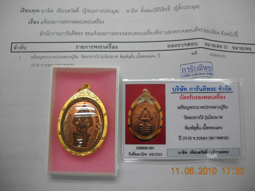 ผมประมูลได้ แล้วแจ้งผูตั้งประมูลเพื่อส่งพระตรวจสอบอีกครั้ง เนื่องจากบัตรเดิมพระไม่ได้ใส่กรอบทอง แต่รายการตั้งประมูลใส่กรอบทอง จึงประสงค์ให้เปลี่ยนบัตรใหม่ เช็คสภาพพระใหม่ รูปจะได้ตรงความจริง เพราะบัตรเดิมระบุสภาพสวย ครับ