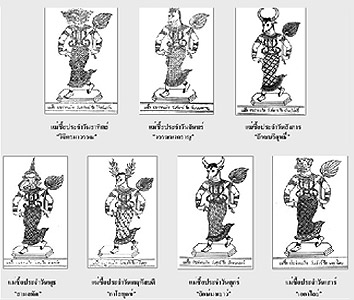 วันเสาร์ ชื่อว่า “เอกาไลย์” มีหัวเป็นเสือ ผิวกายสีดำ ทุกตนทรงอาภรณ์(เสื้อผ้า)สีทอง |
