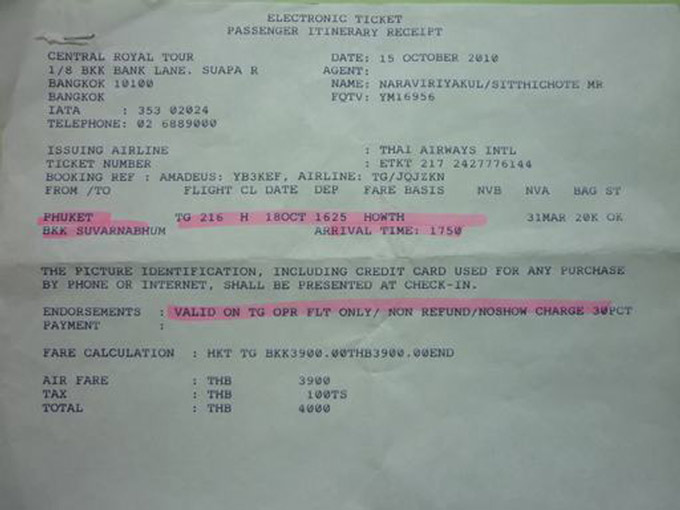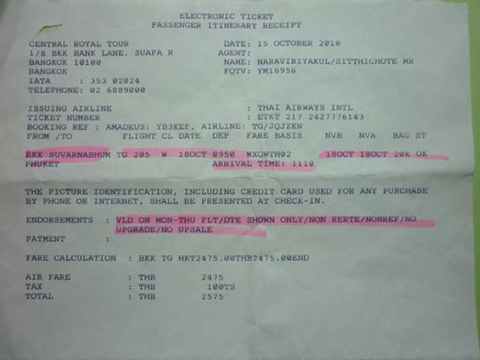 คาซาโนว่า-7 ได้ส่ง หลักฐานค่าตั๋วเครื่องบิน ทั้งขาไป และขากลับ ซึ่งไม่เท่ากัน คือขาไป 2,575 บาท ขากลับจากภูเก็ต 4,000 บาท รวม ไป-กลับ 6,575 บาทครับ ..... นี่คือคำตอบครับ ว่าค่าตั๋วเครื่องบิน กรุงเทพ – ภูเก็ต – กรุงเทพ ของสายการบินไทย เป็นเงิน 6,575 บาท ครับ