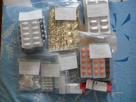 วันนี้ผมไปพบแพทย์ที่โรงพยาบาลไฟฟ้านครหลวงเพื่อเจาะเลือดหาค่าน้ำตาล+ไขมันในเส้นเลือดและขอยามากิน ทุกๆสองเดือน .... ลองชมภาพซองยาที่หมอจ่ายมาให้นะครับ รวมยาหยอดตาบันเทาการจับตัวแข็งของโปรตีน ทำให้เป็นต้อกระจกด้วยครับ ... รวมแล้ว เป็นยา 9 ขนาด/อย่าง ครับ  |