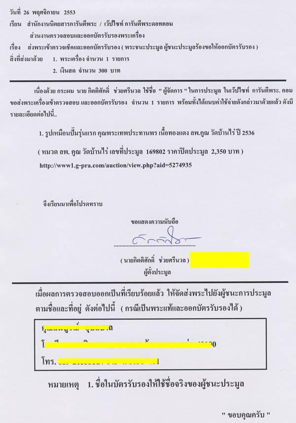 การส่งพระเข้าตรวจสอบและออกบัตรเป็นชื่อผู้ชนะประมูลตามการร้องขอ ต้องมีแบบฟอร์มในการจัดส่งครับ