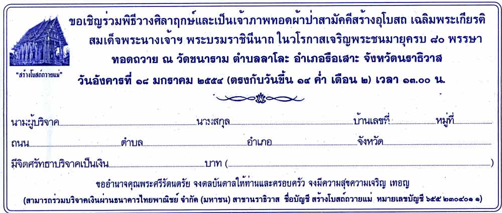 แจ้งข่าวงานบุญ .. ขอเชิญร่วมบริจาคเงิน ทอดผ้าป่าสามัคคี เพื่อสร้างอุโบสถ เฉลิมพระเกียรติ สมเด็จพระนางเจ้าฯ พระบรมราชินีนาถ ในวโรกาสเจริญพระชนมายุครบ 80 พรรษา (สร้างโบสถ์เพื่อแม่)