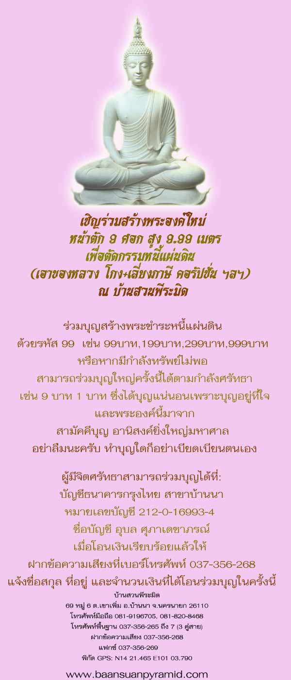 ร่วมบุญสร้างพระชำระหนี้แผ่นดิน ณ. บ้านสวนพีระมิด หน้าตัก 9 ศอก สูง 9.99 เมตร