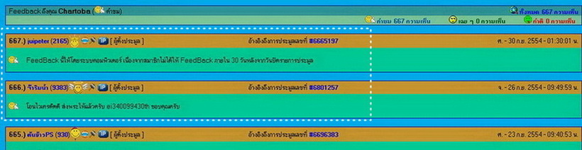 - FB 667 ส่วนของท่าน juipeter FeedBack นี้ให้โดยระบบคอมพิวเตอร์ เนื่องจากสมาชิกไม่ได้ให้ FeedBack ภายใน 30 วันหลังจากวันปิดรายการประมูล