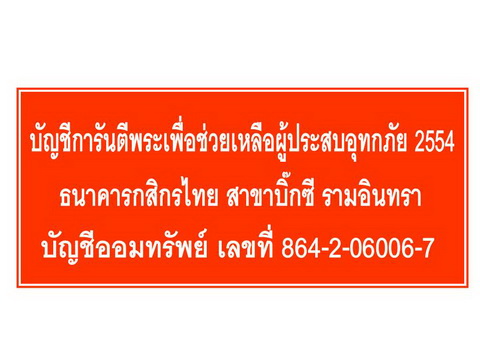 - เนื่องจากเพื่อนๆชาวไทยหลายจังหวัดได้ประสบอุทกภัยกันมาหลายเดือนอย่างต่อ เนื่อง ทางเว็บไซต์ฯจึงได้ดำเนินการเปิดบัญชีธนาคารเพื่อรับบริจาคจากท่านสมาชิกที่ มีจิตศรัทธาโดยใช้ชื่อว่า *** การันตีพระเพื่อช่วยเหลือผู้ประสบอุทกภัย 2554 ธนาคารกสิกรไทย สาขาบิ๊กซีรามอินทรา บัญชีเลขที่ 864-2-06006-7 *** ทางเว็บไซต์ฯจึงขอเชิญท่านสมาชิกทุกท่านที่มีจิตศรัทธาเข้าร่วมบริจาค หรือ ตั้งประมูลพระเครื่องบริจาครายได้เพื่อช่วยเหลือผู้ประสบอุทกภัยในครั้งนี้ ร่วมกับทางเว็บไซต์ฯ หรือท่านสมาชิกสามารถเสนอขายพระเครื่องในกระดานเสนอขายพระเครื่องโดยระบุ วัตถุประสงค์ในการนำรายได้เพื่อช่วยเหลือผู้ประสบอุทกภัยในครั้งนี้ได้นะคะ