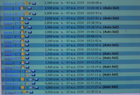 ด้วยความไม่แน่ใจว่าคุณจะซื้อจริงหรือเปล่า กันไว้ดีกว่าแก้ดิฉันเลย โทรหาศิษย์พระเจ้าให้ช่วยเคาะกันคุณ PAT22 สัก 1 เคาะ เพียงเพื่อว่าให้คุณ pat22 ไม่สู้ราคาแล้วถอดใจไปเอง แต่เหมือนว่าคุณต้องการพระหรืออะไรซักอย่าง คุณได้ Auto bid ไว้ 6,500 บาท ทางดิฉันก็เลยต้องขอให้ศิษย์พระเจ้าเคาะไล่ราคาจนให้คุณไม่สู้ซึ่งดังรูปที่เห็น