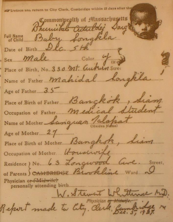 ในพระสูติบัตร แรกคลอด พระบาทสมเด็จพระเจ้าอยู่หัวยังไม่มีพระนาม เพราะในรัชกาลที่ ๖ เวลานั้นคนไทยยังไม่ได้ใช้นามสกุล จึงใช้นามว่า Baby Songkla เป็นโอรสของหม่อมสังวาลย์ ในเจ้าฟ้ามหิดลอุลยเดชฯ กรมขุนสงขลานครินทร์ เนื่องจากยังไม่ได้รับพระราชทานนามสกุล เมื่อประทับอยู่อเมริกา กรมขุนสงขลานครินทร์ (พระบรมราชชนก) ทรงใช้พระนามว่า MR. Mahidol Songkla และหม่อมสังวาลย์ก็ใช้ MRS. Songkla ลูกๆ จึงใช้นามสกุล "สงขลา" ต่อมาพระบาทสมเด็จพระปกเกล้าเจ้าอยู่หัว ตั้งชื่อให้ว่า BHUMIBAL และในวันที่ ๑๓ ธันวาคม ๒๔๗๑ ครอบครัวเสด็จกลับประเทศไทย จึงได้เริ่มตั้งราชสกุล เป็น มหิดล ซึ่งได้รับพระราชทานจากรัชกาลที่ ๗ |
