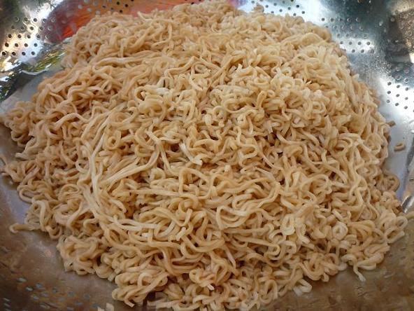 มาม่า 5 ซอง นำมาลวกน้ำร้อนให้นุ่มเพื่อนำมาผัด