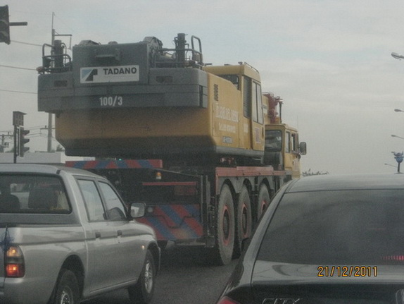 - ตามรูป ที่ 1 เป็นรถโมบายเครนขนาดใหญ่ไม่ต่ำกว่า 80 ตัน ปกติรถพวกนี้ไม่สามารถขับขี่หรือนำมาวิ่งบนถนนหลวงได้เหมือนกับรถยนต์ทั่วไป(ยานพาหนะ)เพราะว่าไม่ได้จดทะเบียนและกรมขนส่งก็ไม่รับจดทะเบียนอยู่แล้ว เพราะมีขนาดใหญ่จัดเป็นประเภทเครื่องจักร เวลาจะเคลื่อนย้ายไปไหนมาไหนจะต้องใช้รถบรรทุก(เทรลเล่อ)ที่ออกแบบมาให้เหมาะสมและถูกต้องตามหลักการรับน้ำหนักเมื่อขับขี่ไปบนถนนหลวง(ถูกต้องตามหลักการกระจายน้ำหนักลงบนพื้นถนน)