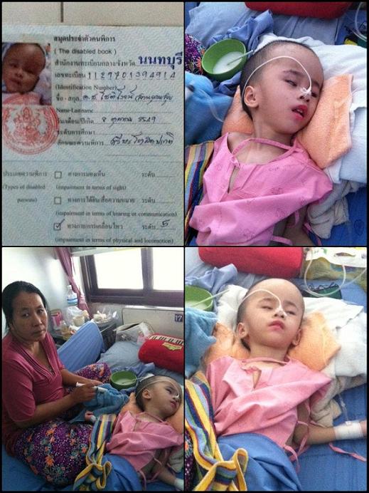 เมื่อสัปดาห์ก่อนพาน้องอั่งเปา(ลูกชาย)ไปนอนรพ.ชลประทาน อ.ปากเกร็ด จ.นนทบุรี (อยู่เยื้องกับ วัดชลประทานฯ) ได้เจอกับน้องคนนึงน(น้องบู)นอนพักรักษาตัวที่รพ. น่าสงสารมากค่ะ กำพร้าแม่ เพราะแม่ทิ้งไปตั้งแต่ได้2เดือน คุณพ่อติดคุก(ยังไม่พ้นคดี) ตอนนี้อยู่กับคุณยายพยุง(ในรูป) เลี้ยงดูกันมา เป็นเวลา 5ปีแล้ว น้องเพิ่งจะมาเป็นโรคนี้ตอนเกิดมาได้ 6 เดือนแล้วถึงเป็นซึ่งตอนแรกคุณหมอบอกว่าอาจจะอยู่ได้ไม่ถึง2ปี หมอบอกคุณยายว่าถ้าดูแลไม่ได้ก็ให้มาไว้ที่ รพ.(เด็กศูนย์)ก็ได้ แต่คุณยายทำไม่ได้เพราะรักและสงสารหลานและด้วยความรักที่คุณยายพยุงมีให้ คอยดูแลทะลุถนอมจนน้องสามารถอยู่ได้ทุกวันนี้ ถ้านอน รพ.นาน รายได้คดุณยายก็ไม่มีต้องกลับไปดูแลที่บ้านต่อเพราะ คุณยายเองก็ลำบากเพราะต้องดูแล คุณพ่อคุณแม่ของคุณยายที่แก่ชราอีกด้วย รายได้ก็มีต่อวันคุณยาย เย็นเสื้อผ้าโหลเด็ก โหลละ15.- ถ้าทำทั้งวันทั้งคืนก็ประมาณ30โหล ราวๆ 450.- ซึ่งก็ไม่ใช่ทุกวัน แต่มีรายจ่ายที่ตายตัวในเรื่องของน้องบู หลักๆที่สอบถามมาก็จะมี