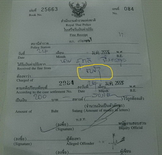 ตั้งโต๊ะรับอังเปา เอ๊ย!เปรียบเทียบปรับ เราก็ลืมดูใบสั่งว่าโดนข้อหาอะไร ฟังแต่เสียงกล่าวโทษจากเจ้าหน้าที่ๆออกใบสั่ง "พี่ไม่คาดเข็มขัด ป้ายทะเบียนก็ไม่ใช่ของทางราชการนะพี่"(ป้ายปลอม ป้ายจริงหลุดตอนน้ำท่วม) โชคดีหน่อยปรับแค่ 200 จริงๆต้องปรับ 500