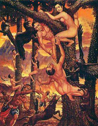 อสิปัตตวนนรก สัตว์นรกที่มาเกิดได้รับทุกข์จากป่าไม้ใบดาบ เช่น ใบมะม่วงซึ่งกลายเป็นหอกดาบ และมีสุนัข แร้งคอยทรมานขบกัดกินเลือดเนื้อจนกว่าจะสิ้นกรรม