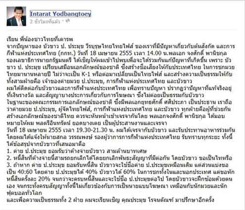 วันที่ 18 เมษายน 2555 เวลา 19.30-21.30 น. ผมได้เจรจากับบัวขาว และรับประทานอาหารร่วมกันโดยผมได้แจ้งให้นายสกล วรรณพงษ์ รองผู้ว่าการการกีฬาแห่งประเทศไทย รับทราบทุกระยะ ทั้งนี้ได้ข้อสรุปจากบัวขาวที่เสนอมาคือ