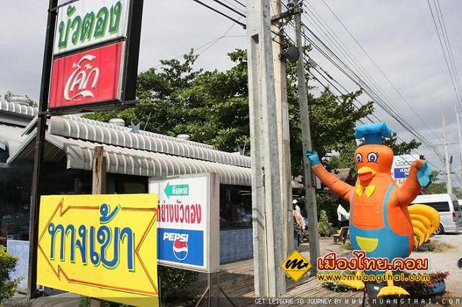 ไก่ย่างสามแยกวิเชียรบุรี ร้านบัวตอง ไก่ย่างของที่นี่มีสูตรพิเศษเฉพาะตัว คือจะเน้นที่เครื่องหมักเครื่องปรุงไก่ที่มีส่วนผสมจากพืชสมุนไพรไทย ๆ ไม่ว่าจะเป็นตะไคร้ กระเทียม หัวหอม โดยเขาจะเอาสมุนไพรพวกนี้หมักกับตัวไก่พร้อม ๆ กับนมสด เพื่อเพิ่มความหอม หวาน มัน และทำให้เนื้อไก่นุ่มเนียน หมักกันแบบข้ามวัน คือทิ้งไว้ทั้งคืนเพื่อให้ส่วน ผสมทั้งหมดแทรกซึมเข้าไปในเนื้อไก่ เสร็จแล้วนำมาย่างด้วยเตาถ่านให้สุกหอม...ในวันหนึ่ง ๆ ทางร้าน ต้องใช้ไก่ถึง 150 ตัว ในวันธรรมดา และ 250 ตัวในวันเสาร์-อาทิตย์เลยทีเดียว ส่วนน้ำจิ้มนั้นใช้มะขามเปียกกับน้ำตาล ปรุงรสด้วยกระเทียม พริก เครื่องปรุงต่างๆ จนเข้าที่ นำมาเคี่ยว ด้วยไฟอ่อนตั้งแต่เย็นจนถึงเช้า เมื่อเสร็จแล้วก็จะได้น้ำจิ้มรสเข้มข้นแถมยังเก็บได้นานโดยไม่เสียอีกด้วย จานเด็ดอื่น ๆ ของที่นี่อย่างส้มตำ ลาบเป็ด อร่อยทุกอย่างจริง ๆ รสชาติจัดจ้าน อร่อยแบบถึงเครื่อง ผักสดกรอบ ความสด สะอาด เป็นสิ่งสำคัญที่สุดถือเป็นเคล็ดลับความอร่อยก็ว่าได้ แวะเวียนไปชิมกันได้ ทุกวันตั้งแต่ 7 โมงเช้าถึง 6 โมงเย็น