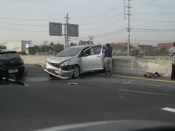 -- ตามรูป เช้านี้เองครับ มอเตอร์เวย์ฝั่งขาออก ก่อนข้ามแม่น้ำบางปะกง คาดเดาว่ามาเร็วแน่นอน โชคดีที่ไม่มีใครได้รับอันตราย . . .