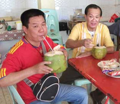 ภาพนี้ถ่ายบนฝั่งตรงข้ามพระเจดีย์กลางน้ำ อยู่ที่เมืองสิเรียม ระยะทางประมาณ 40 ก.ม. จากเมืองย่างกุ้ง ประเทศพม่า เมื่อปีที่แล้ว ... พวกเราข้ามไปกราบนมัสการพระเจดีย์กลางน้ำกันแล้ว กลับขึ้นฝั่ง หิวน้ำ จึงสั่งมะพร้าวอ่อนมาดื่มน้ำกัน