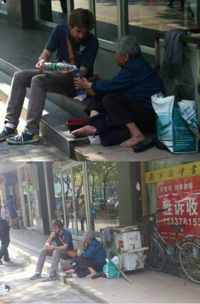 เมื่อวันที่ 5 พฤษภาคม เว็บบล็อกชื่อดังเวยโป๋ ได้มีการเปิดเผยภาพแห่งความประทับใจให้กับชาวเน็ตจีนอย่างไม่รู้ลืม ของหนุ่มอเมริกันคนหนึ่ง ที่กำลังนั่งกินเฟรนช์ฟรายกับคุณยายขอทานหน้าประตูร้านแมคโดนัลด์ ถนนจูเจียง เมืองหนานจิง มณฑลเจียงซู ประเทศจีน โดยที่ไม่มีการถือตัวแต่อย่างใด