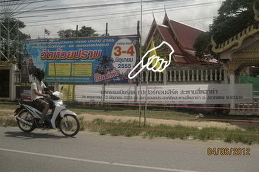 - ตามรูป จะเห็นว่ามีป้ายผ้าสีขาวๆ ติดอยู่ที่กำแพงวัด อ่านข้อความแล้ว ทำไมหนอไอ้คนที่นำป้ายมาติดมันไม่มีจิตใต้สำนึกสักนิดเลยหรือนี่ . .
