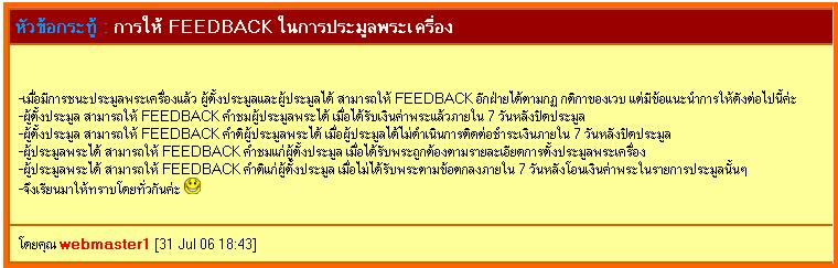 - ผู้ตั้งประมูลเมื่อได้รับเงินจากการประมูลและเช็คยอด ควรจะรีบ Feedback ให้ผู้ชนะประมูล ทันทีครับ...ไม่ได้ให้ต้องรอพระส่งมาถึง และให้ผู้ชนะการประมูล Feedback ก่อนนะครับท่าน...