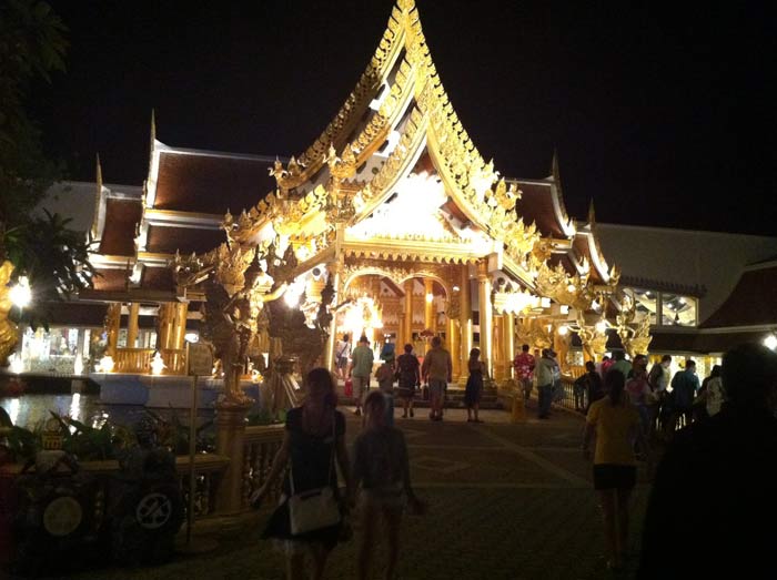 เดินอยู่ประมาณ 1 ชั่วโมงเต็ม ก็เริ่มหิว และเห็นว่าถึงเวลาแล้วไปหาอะไรกินดีกว่าครับ ห้องอาหารที่นี่บอกเลยคับ สวยงามอลังการมาก ที่นั่งน่าจะประมาณ 1,000 ที่นั่งเห็นจะได้ ลืมบอกตั๋วที่ไปรับมาจะมีเลขที่นั่งกำหนดไว้แล้วครับ เข้าไปก็มีพนักงานบอกทางให้ครับ เพราะมันกว้างมากจริง ๆ อาหารก็หลากหลายครับ เพราะนานาชาติ แต่ก็เน้นหนักไปทางอาหารไทย รสไม่จัดมากครับ ก็ได้เวลาก็กิน ๆๆๆๆ เดิน ๆๆๆๆ ตักอาหารครับ แต่ขอบอกนะครับ ว่าเดินไกลพอควรเลย เพราะสถานที่กว้างมากจริง ๆ กินไปถ่ายรูปไป จนเราพอใจแหละครับ เพราะรู้เวลาอยู่ว่าเริ่มแสดง 3 ทุ่มตรง แต่ผมรู้แกวครับ เพราะถึงเวลาประมาณ 20.30 น. จะมีการแสดงย่อย ๆ ก่อนที่หน้าโรงละคร โดยจะนำช้างที่เป็นนักแสดงออกมาถ่ายรุปกับนักท่องเที่ยว และที่สำคัญ ต้องไปรอให้ใกล้ประตูทางเข้าไว้ให้มากที่สุดครับ เพราะหากไปช้า คนจะเยอะมากคิวยาวเป็นกิโลครับ กว่าได้เข้าไปนั่งจะรอนานจนเมื่อยครับ